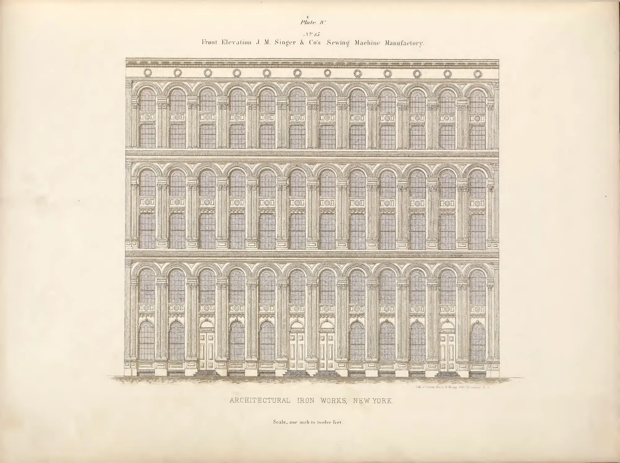 Italianate store front with round-arched openings, engaged columns, and ornamental spandrel panels for retail facades.
