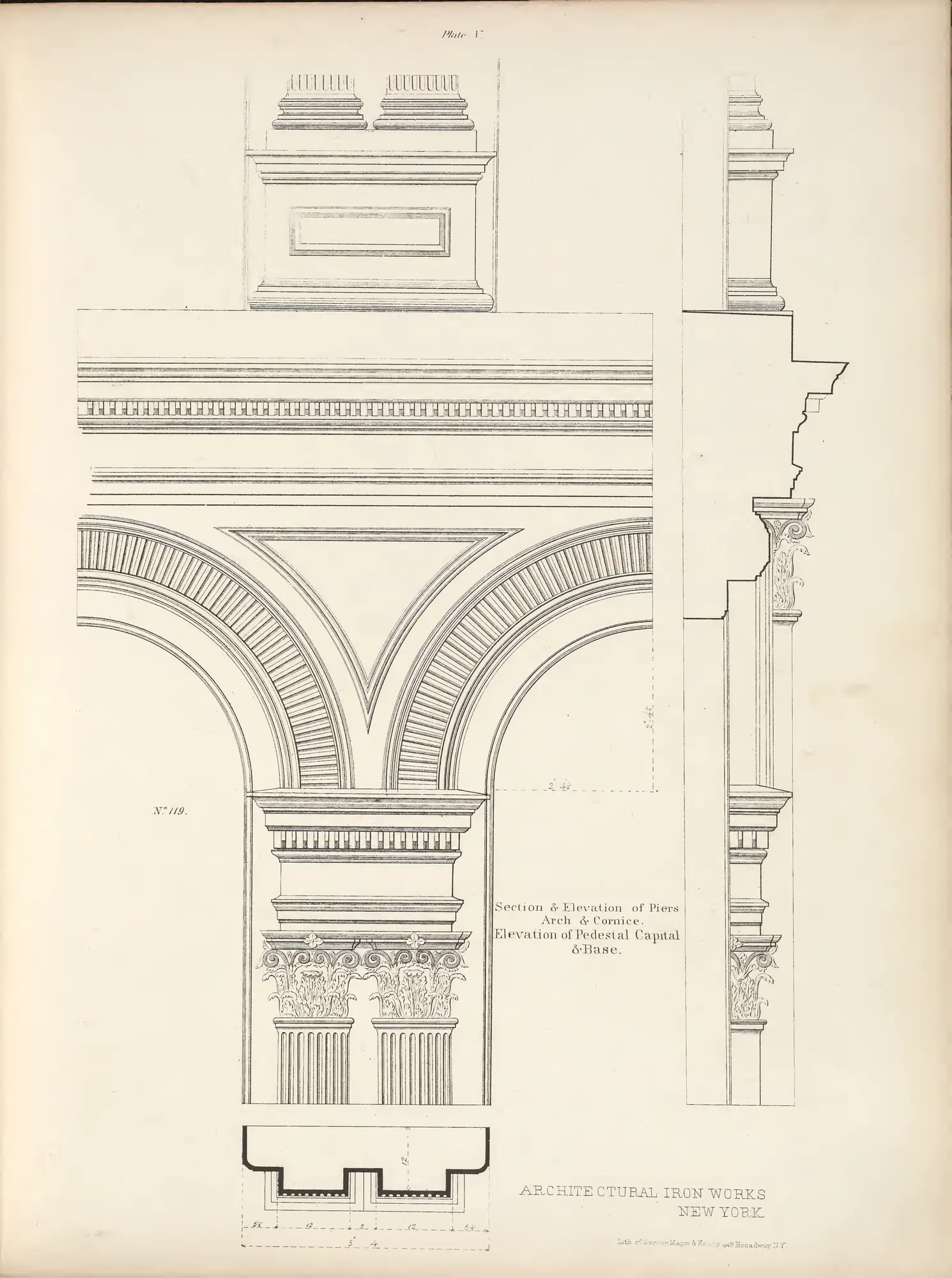 Detailed designs for cast-iron arches, spandrel ornaments, and arch keys with acanthus leaf and scroll motifs.