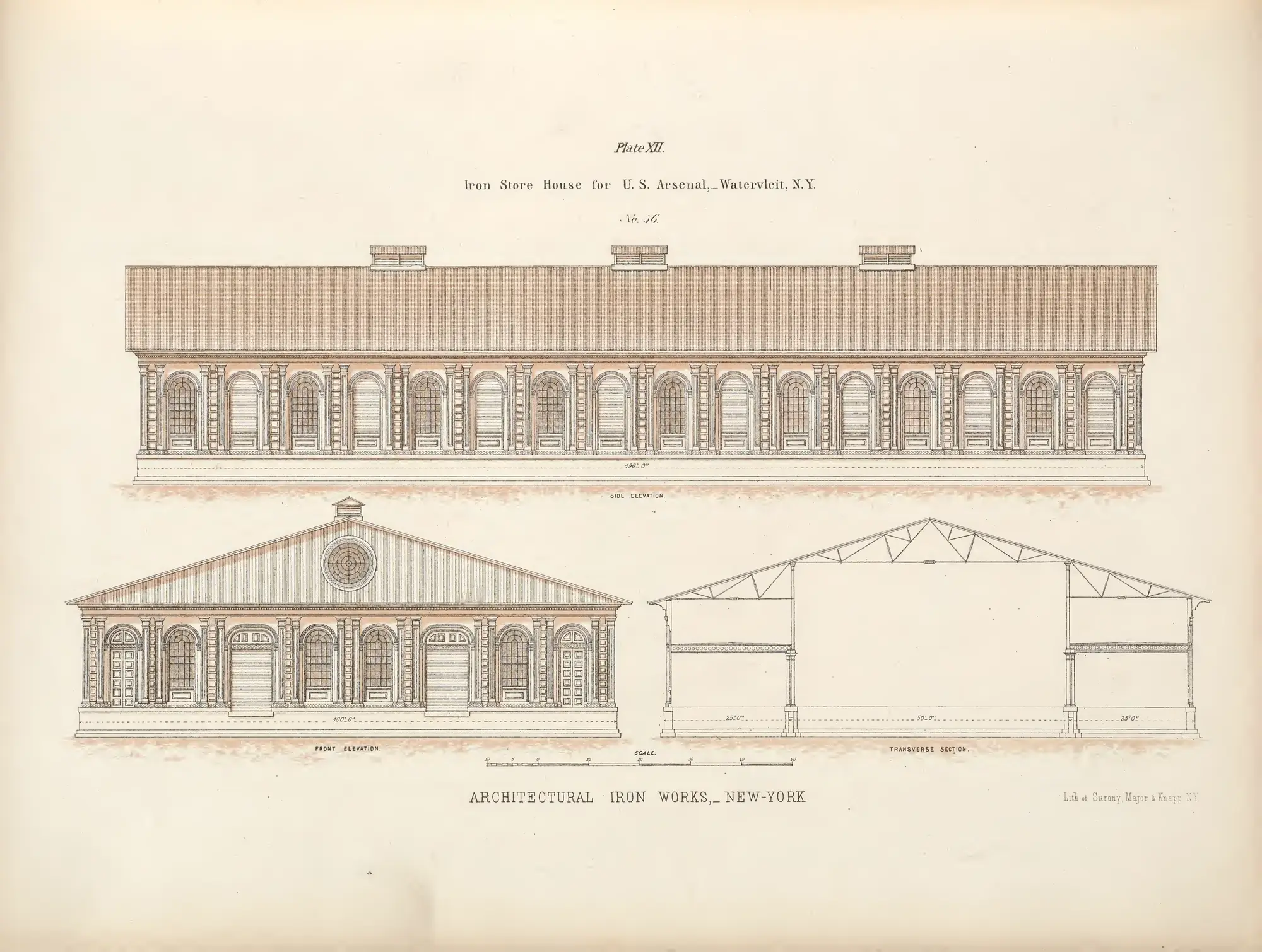 Front and end elevation and section of an iron store house erected for the U.S. Government, showing prefabricated modular construction.