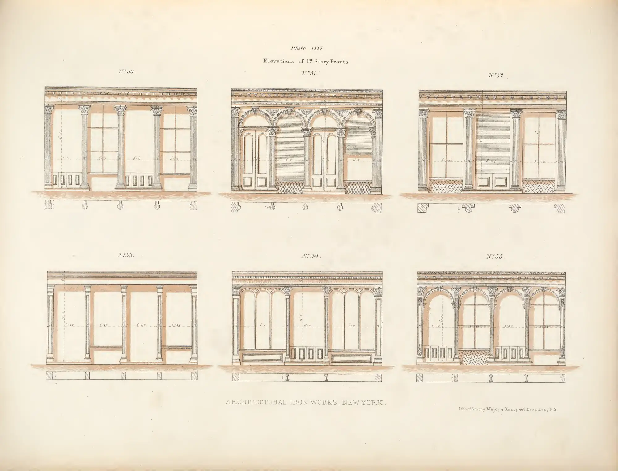 Elevations and plans of first-story fronts (No. 50 and 51) with arrangements for folding shutters and transom lights.