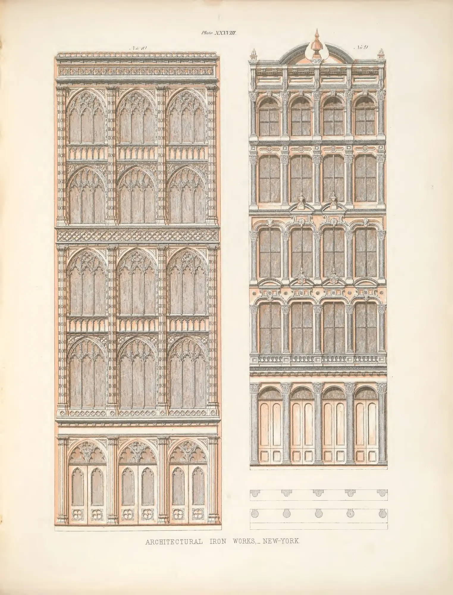 Two elaborate cast-iron building facades — a Gothic Revival design (No. 41) with pointed arches and tracery, and an Italianate design (No. 11) with round arches and a domed cupola, plus cornice detail.