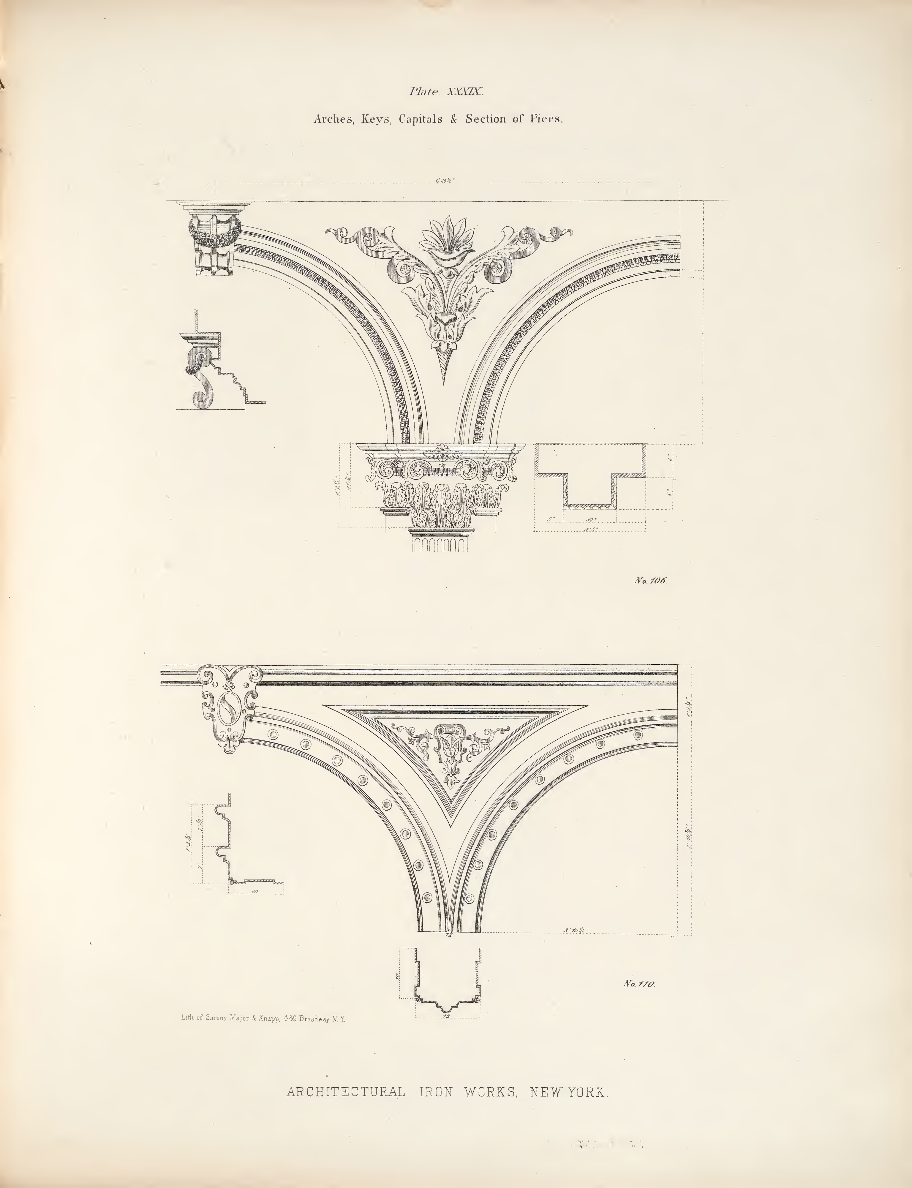 Detailed studies of cast-iron arch spandrels with acanthus and scroll ornamentation, Corinthian capitals with plan sections, and pier cross-sections (No. 106, No. 110).