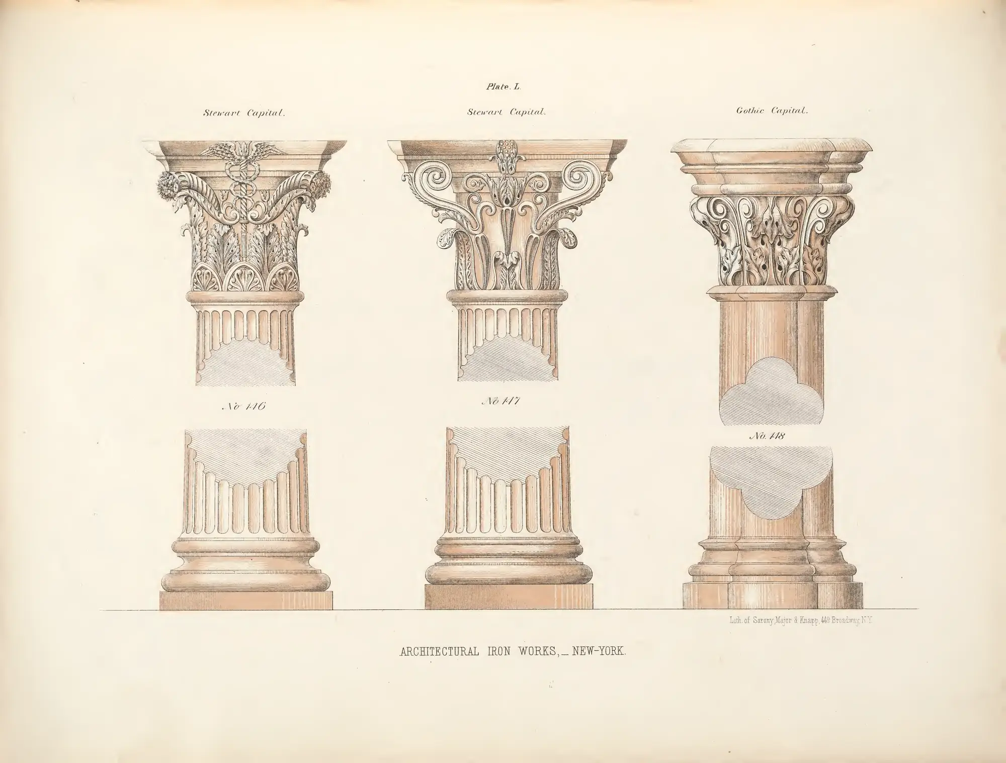 Vertical building section with floor plan layouts showing cast-iron column grids, girder placements, and stairwell locations.