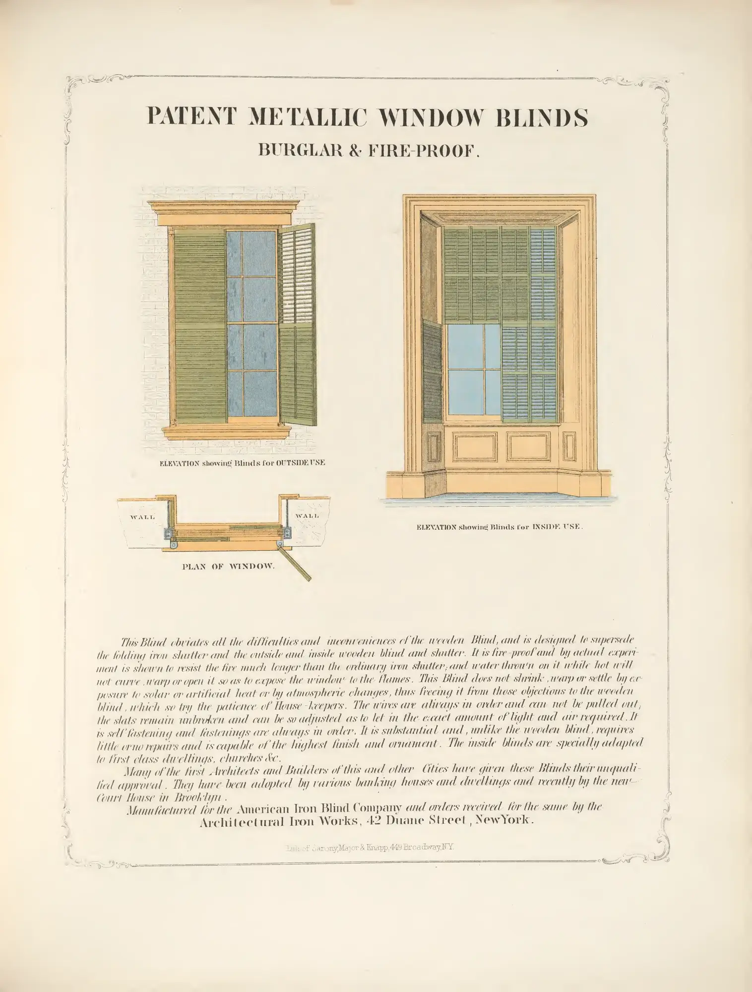 Patented metallic window blinds, burglar and fire-proof, showing louver mechanisms and mounting details for commercial buildings.