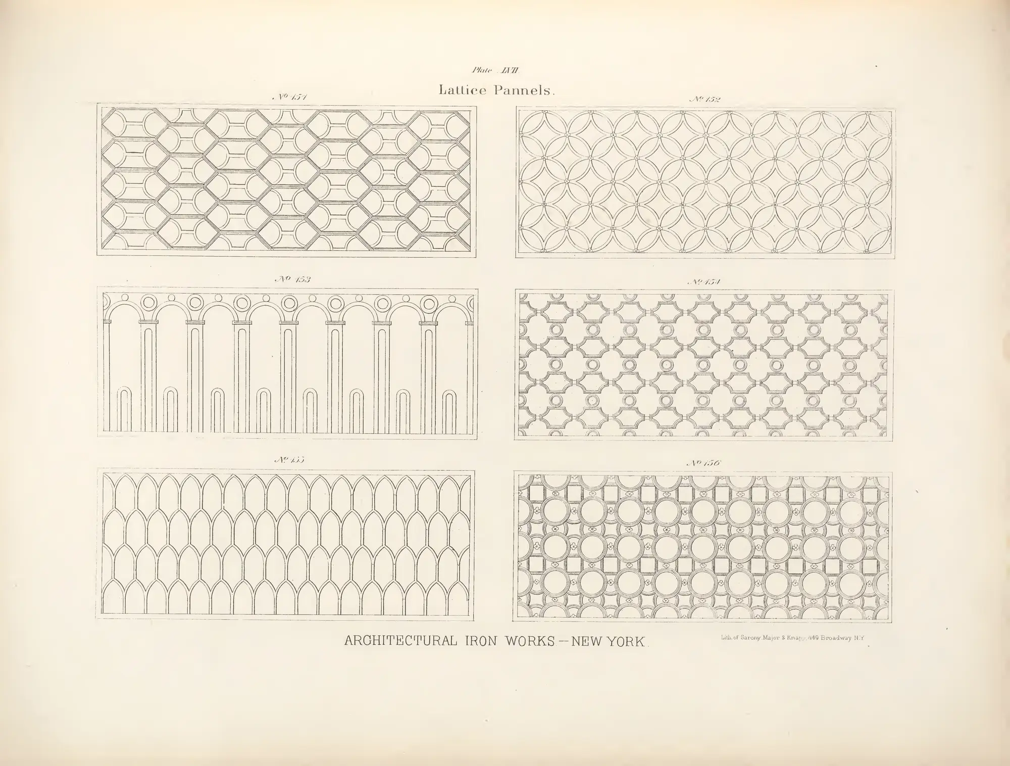 Cast-iron lattice work panels, wire window guards, and protective grille designs for banks, offices, and institutions.