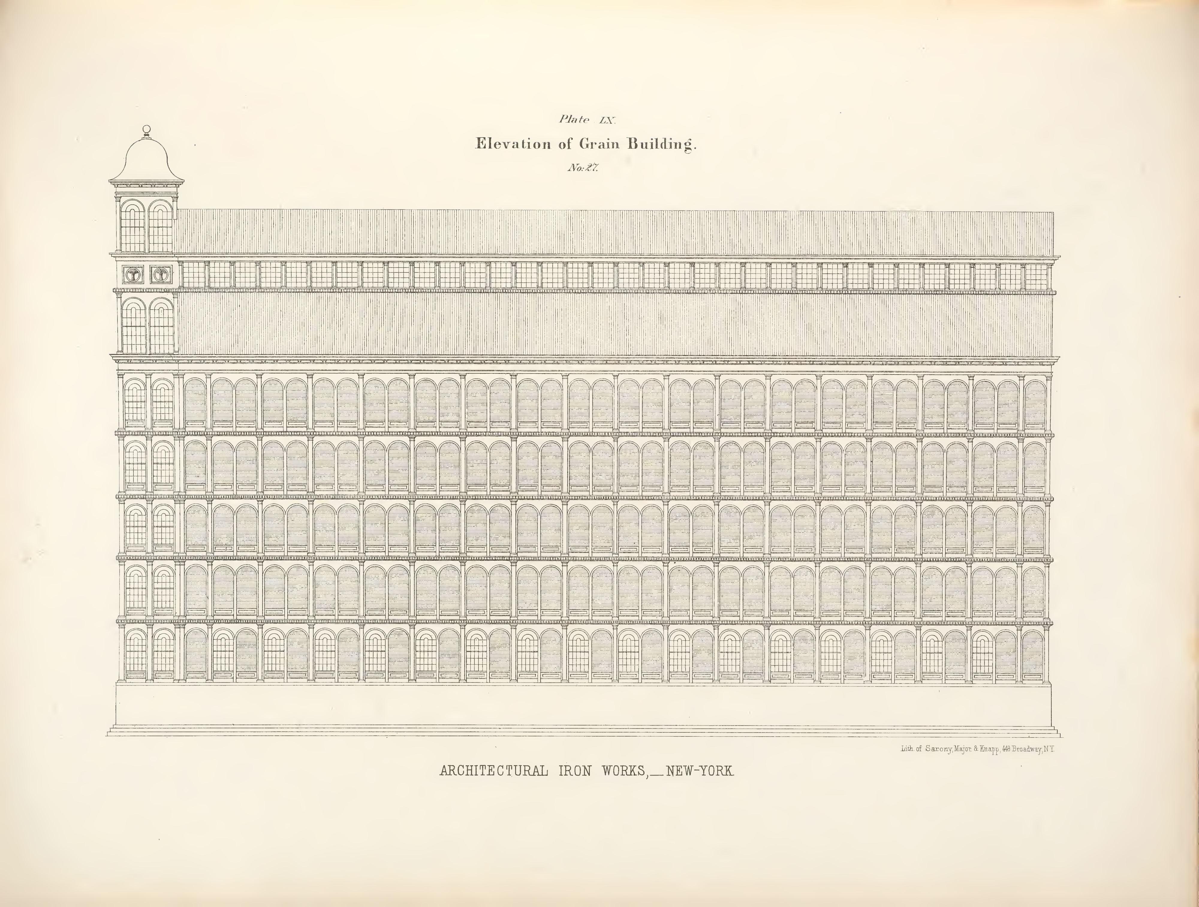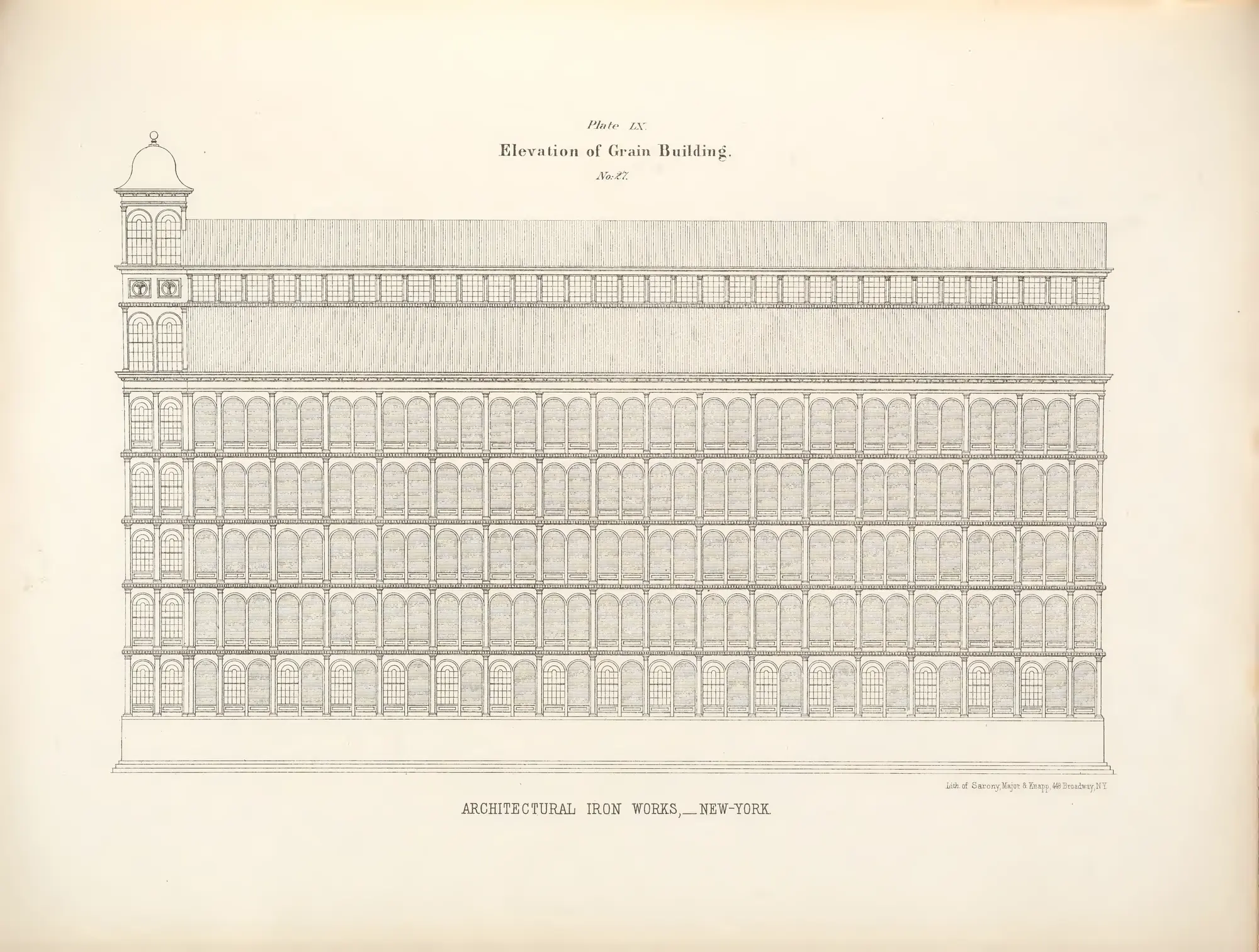 Full front elevation of a massive cast-iron grain building (No. 47) with repetitive arched bays across six stories, tower element with cupola, and monumental industrial scale.