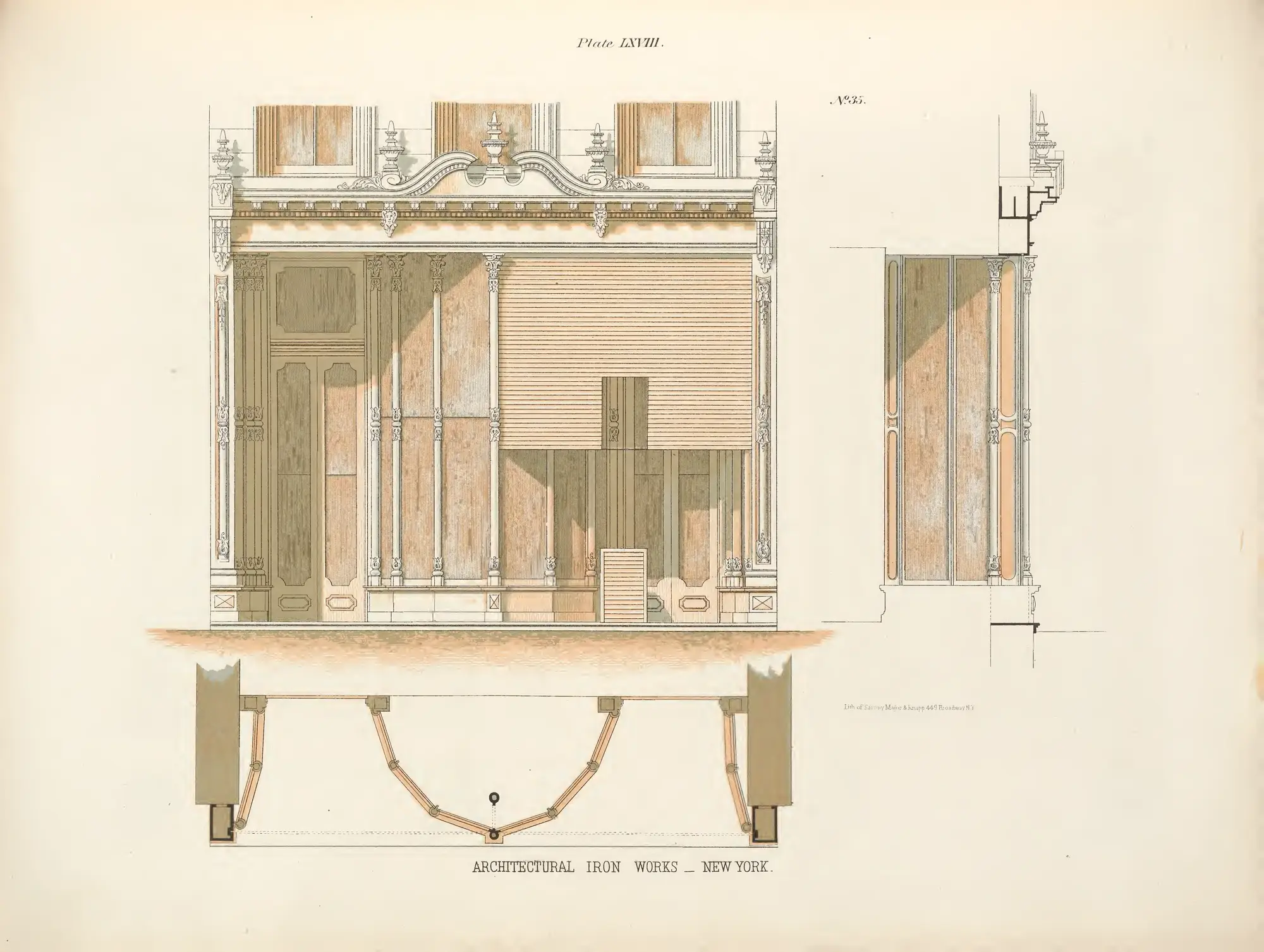 Gothic and Renaissance-style balcony front panels with quatrefoils, trefoils, and tracery motifs executed in cast iron.