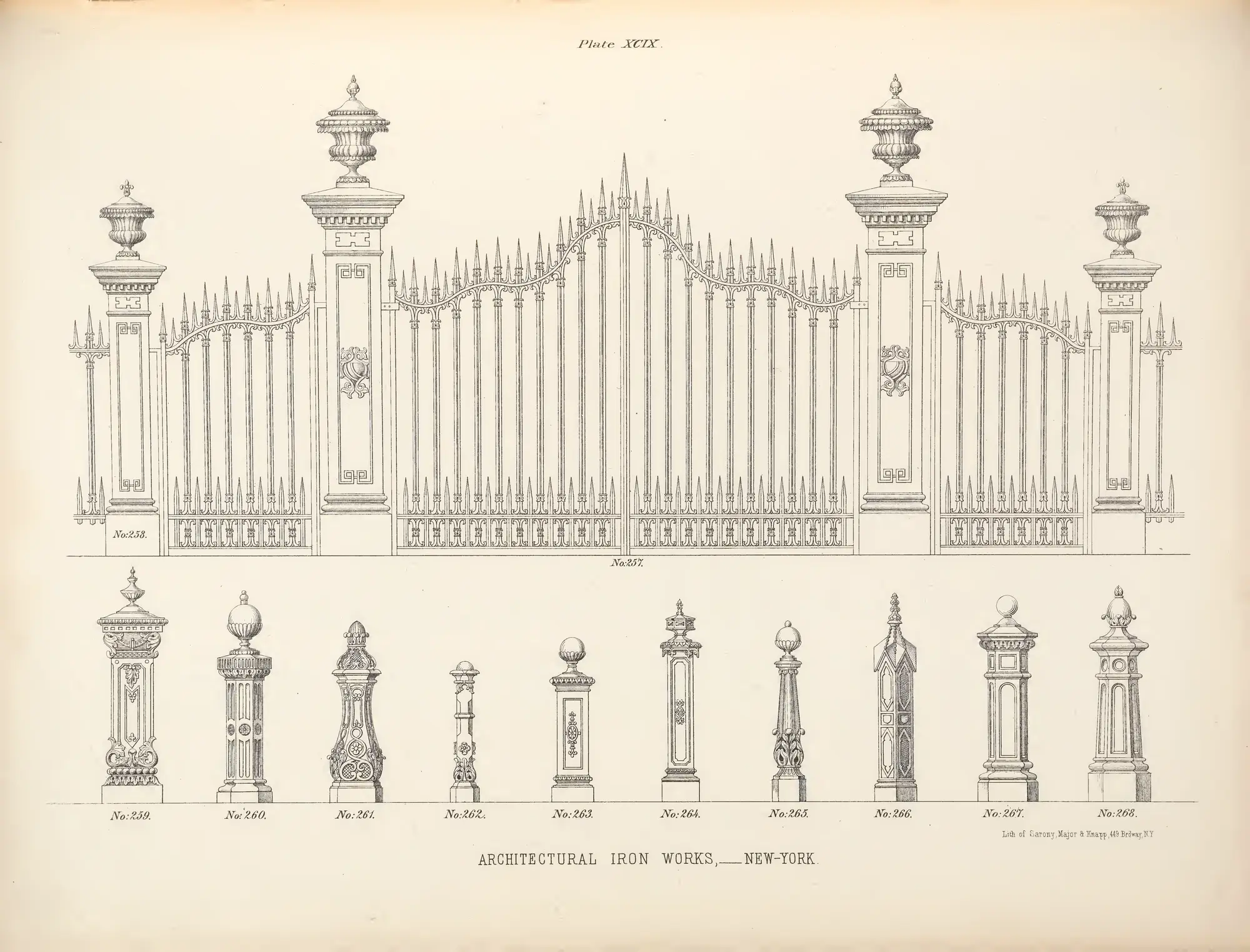 Neoclassical gate with Greek key and acanthus motifs, plus ten fence post designs in classical revival styles.